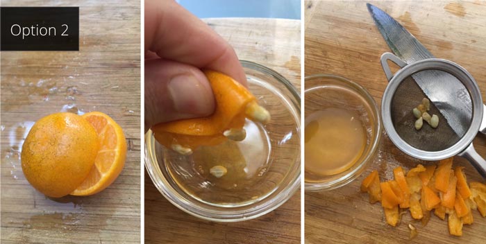 - Option 2 – Slice each calamondin fruit in half, squeeze the juice and seeds into a bowl then strain out the seeds. Once that’s done, you’ll need to slice the skins into strips on a cutting board. Some people prefer this method, but it seemed slower to me. Maybe time yourself doing both and see which method you prefer!