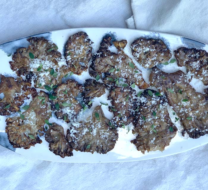 The result isn’t akin to a thick bovine steak per se, it’s more of a thin, highly flavorful strip of cauliflower mushroom which you’ll then garnish with fresh-grated Parmigiano-Reggiano cheese, fresh thyme, salt, and a splash of lemon juice.