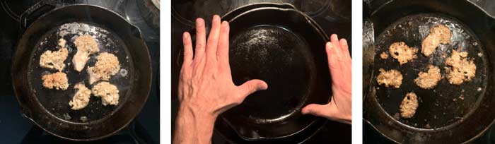 IF you don’t have two pans that will stack together, you can also use a single pan and do your mushroom flattening with a metal spatula, possibly assisted by pressing down harder with a bowl on top.