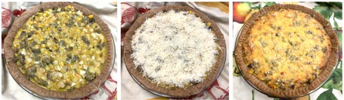 Finally, combine the cooled caramelized onions, mushrooms, cream corn, and beaten duck eggs in a bowl, then pour them into the partially pre-cooked pie crust. Top with fresh-grated parmesan cheese, bake for about 35 minutes until golden brown and you’ve got a delicious cauliflower mushroom quiche!
