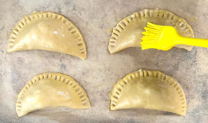 In the photos below, we actually reversed the proper order. You should first score your hand pies with a knife, then give them an egg wash. It’s not the end of the world if you get this order inverted though!