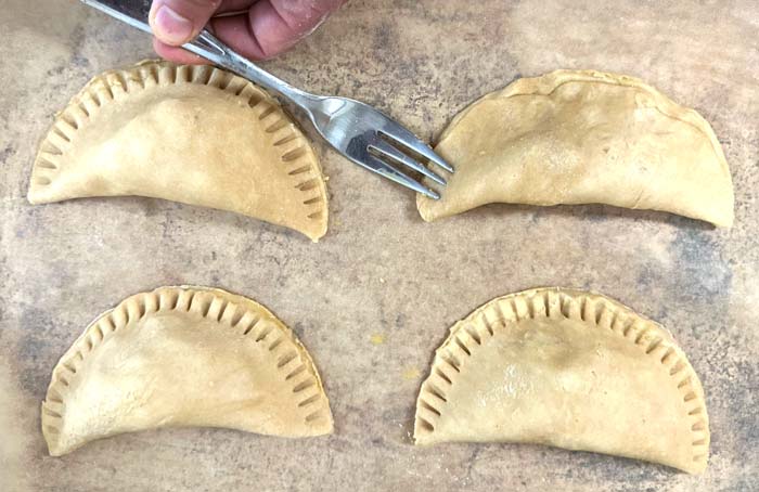 Next, use a fork to push down on the outside edge of each hand pie, helping the dough stick together and providing a decorative touch: