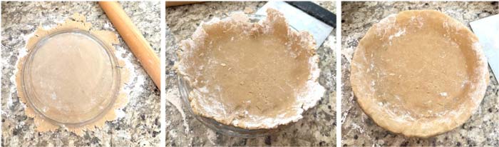 Transfer rolled dough to pie pan and finish forming it with your fingers until the sides and top edges are even.