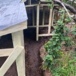 - Trench caging – Trench cages (2′ deep perimeter trench with buried hardware wire attached to base of coop) prevent large animals from accessing the coop but may not fully prevent tunneling rodents. A trench cage is also very difficult to dig and install.
