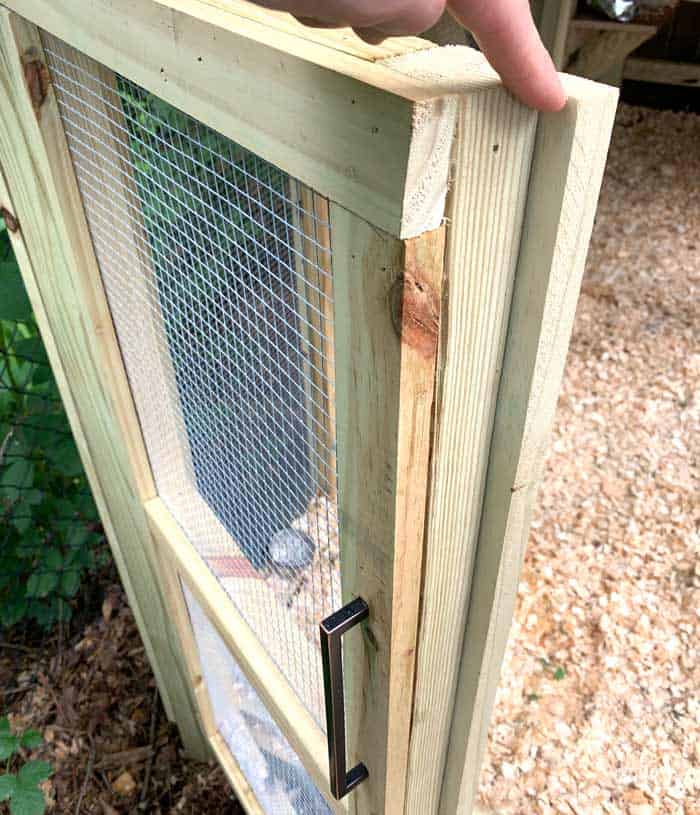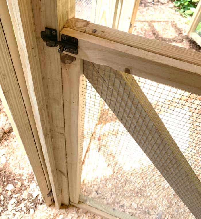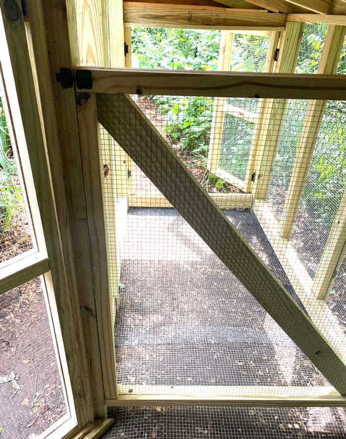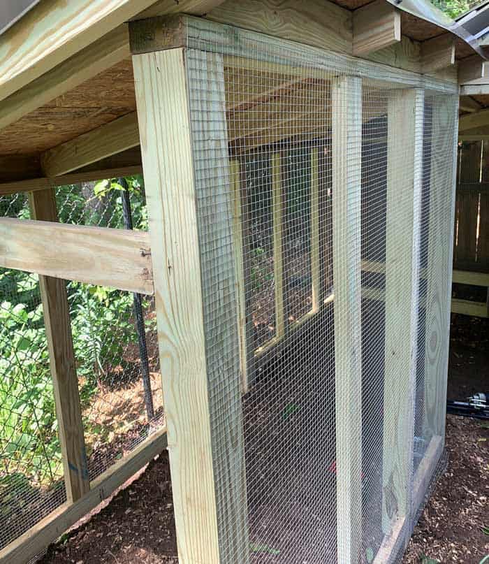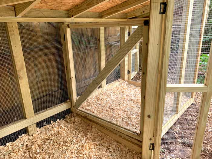 The overall coop should be anchored to the ground (ideal) or heavy enough so that it can’t easily be tipped over by a large predator or blown over by strong winds.