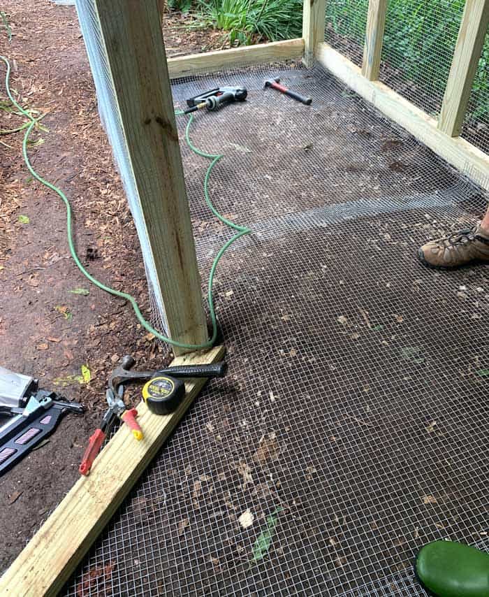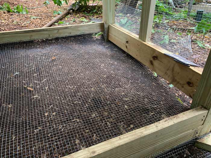 Our preferred solution to predator-proofing a duck coop floor is simple, foolproof, and economical. We install 1/2″ hardware under the coop that is secured to the foundation walls. The hardware wire is installed over the soil with some give to allow people to walk on it without pulling it loose (the soil below provides structural support).