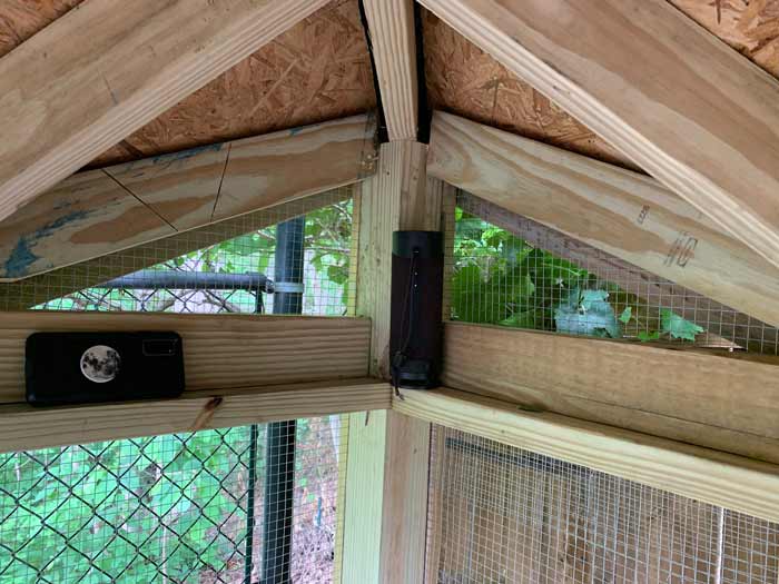 - no large tree branches are hanging overhead that could snap off and fall on the coop;