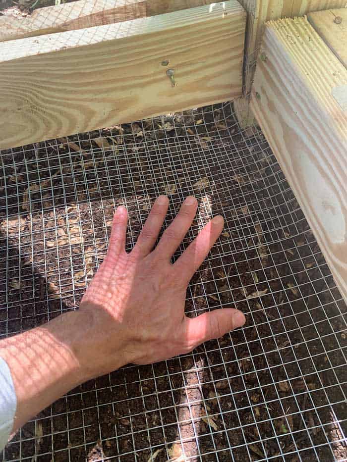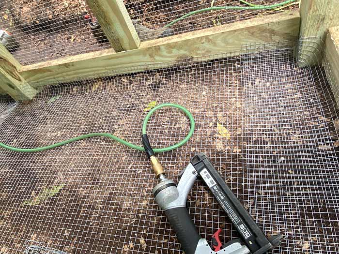 We use large sheets of hardware wire and any overlapping sections have at least 4″ of overlap. Additionally, wherever hardware wire sheets are joined/overlap, wire string securely ties them together. (We use the wire that comes with the hardware wire rolls.)