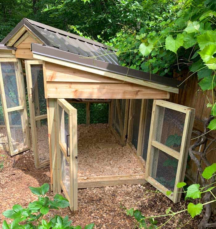 At the same time, we didn’t want a coop so tall it swallowed our back yard or shaded out the muscadine vines growing behind it. Waddle Inn is the perfect height for our needs and features three access doors. At the center point behind the main doors, I (6’1″ tall Aaron) can stand fully upright. I only have to squat a little to walk through the other parts of the coop.