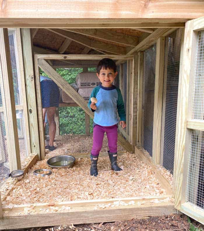 As for the coop floor, concrete will trap moisture inside the coop, especially at the spots where the wood frame and concrete join. That could create hygiene issues/pathogen buildup and will also accelerate wood rot which lessens the life of the coop. We prefer a coop flooring that’s breathable, allows the wood to dry out, and also allows soil microbes and worms to help assist in our modified deep litter method. Every few months when the bedding has built up, we’ll completely remove it and put the old bedding in compost or use it as mulch around our perennial fruit and nut trees. At that point, the bottom layers of bedding will be full of earthworms and mostly decomposed. Then we start over with new bedding and the process repeats.