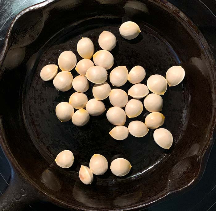 1. Pre-heat a skillet (we like to use antique cast iron) over medium heat, then add a bit of oil plus your ginkgo nuts.