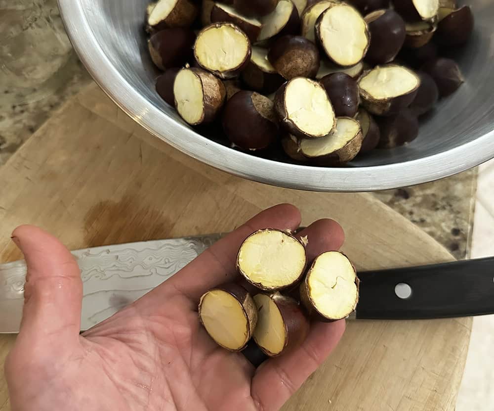 1. No weevils – Make sure your chestnuts do not contain weevil larvae, aka chestnut worms. That’s one of the reasons you’ll be cutting your chestnuts prior to using them: once cut, you can easily inspect the inside of the nuts for weevil damage.