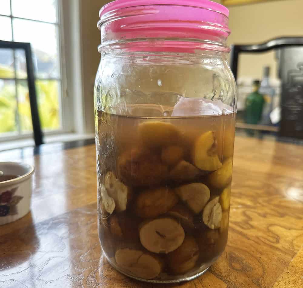 7. Taste daily after one week – After about 1 week of fermentation, start tasting a small amount of the liquid and/or chestnuts so you can monitor how the flavor is developing. Exactly when your fermentation is done is up to you. We let ours ferment for about 14 days before we decided they were done, but you may want to push yours longer.