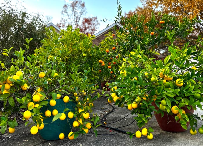 From late spring through late summer when water needs are highest, we install a simple automated drip irrigation system on our potted citrus to keep the plants happy and save us time. Otherwise, we’d have to water our citrus trees twice per day, which would take quite a bit of time.