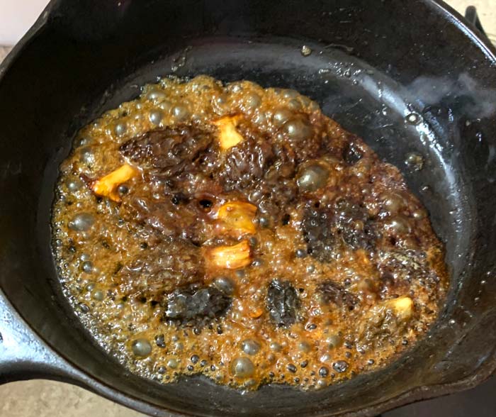 Once each morel is golden brown on each side, add your maple syrup. Turn the morels and use a spatula to make sure each mushroom gets a generous coating of maple syrup. The syrup will thicken quickly and start to caramelize as the water content diminishes.
