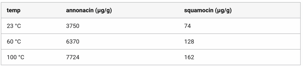 As you can see in the above table, detectable annonacin and squamocin levels more than doubled in pawpaw fruit tested at room temperature versus pawpaw fruit subjected to boiling temperatures.