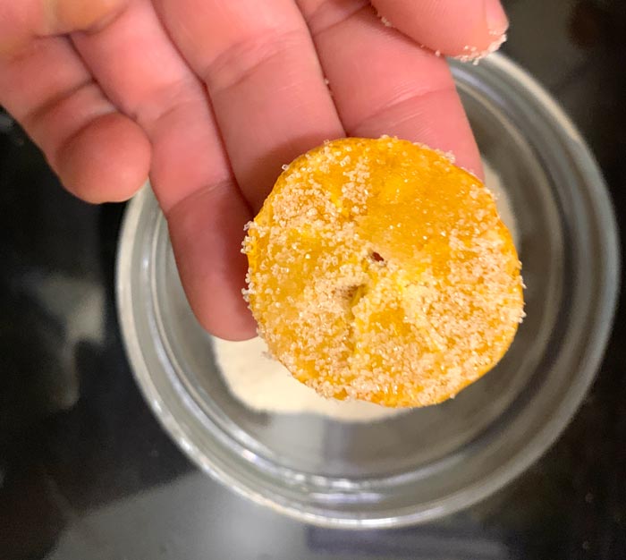 - Small batch – Dredge individual calamondin slices into a bowl of sugar by hand before returning them to the dehydrator.