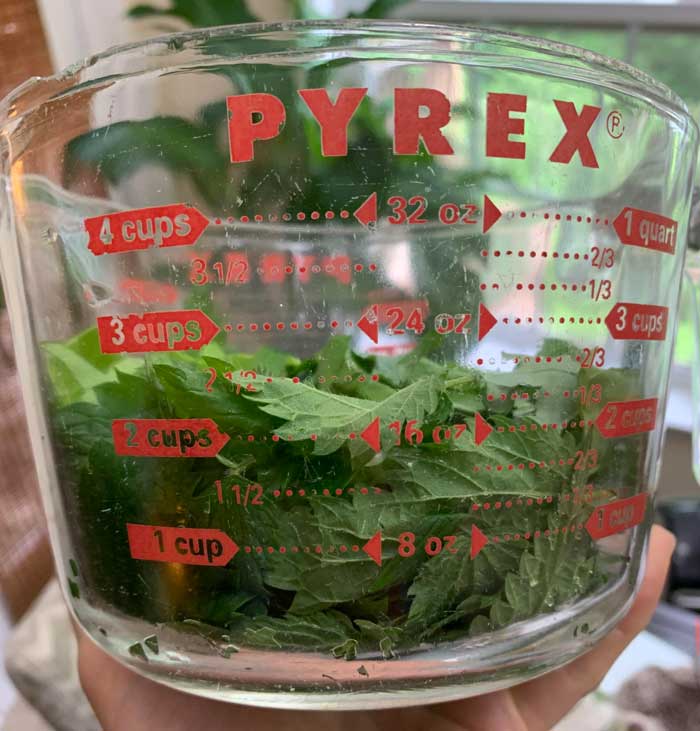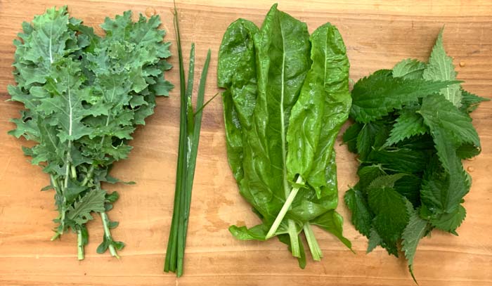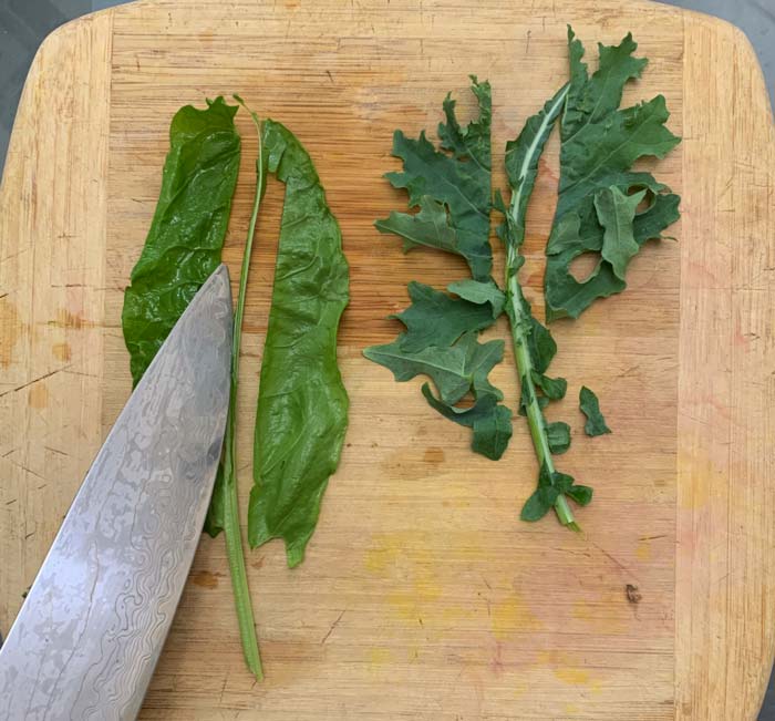 2. Rough chop your raw greens. Exception: don’t chop raw stinging nettle or your hands won’t feel very good (they have small leaves, so no need anywy).