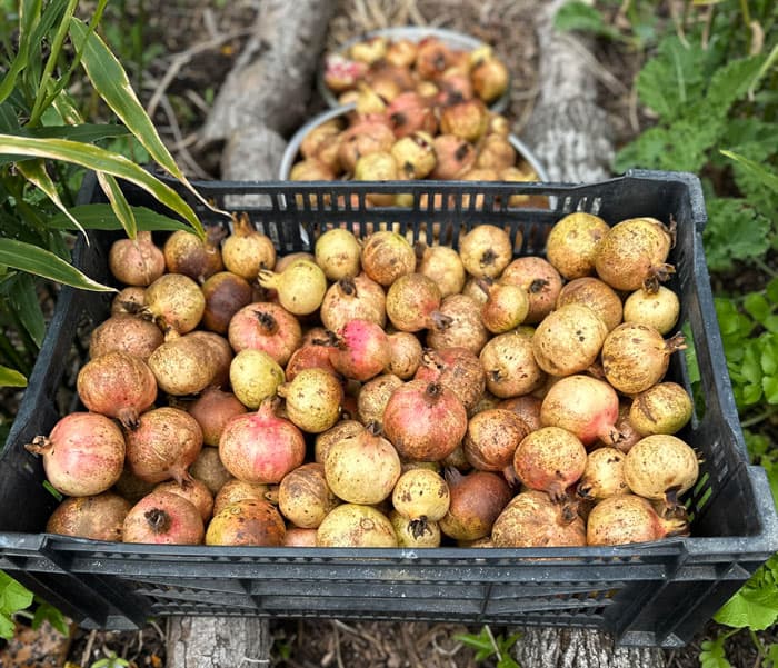 Our 10+ year old heirloom pomegranate trees have matured to the point that they now produce wheelbarrow loads of fruit each fall.