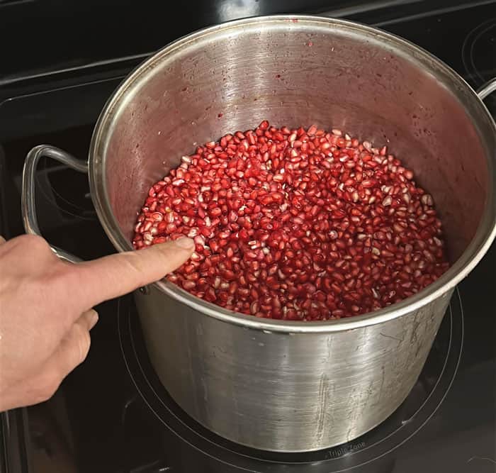 - Place whole pomegranate seeds into pot on stovetop burner turned to medium heat. Add a splash of water to prevent fruit scalding.